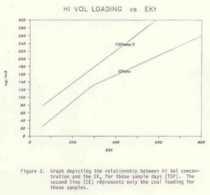 The APCD developed the equation for Kt to guide and optimize wet dust suppression with sprayers in Southeast Newport News. Their 1987 APCB study found a strong relationship between the daily summed Kt (ΣKt) and the amount of particles measured using a high-volume air sampler. The 1987 APCB study cited a 1984 study from the U.S. Environmental Protection Agency (EPA) Office of Air, Noise and Radiation, and the Office of Air Quality Planning and Standards as having reported that dust emissions can become significant at winds of 12 miles per hour.[5] We note that we only found a related report from 1985.[5]