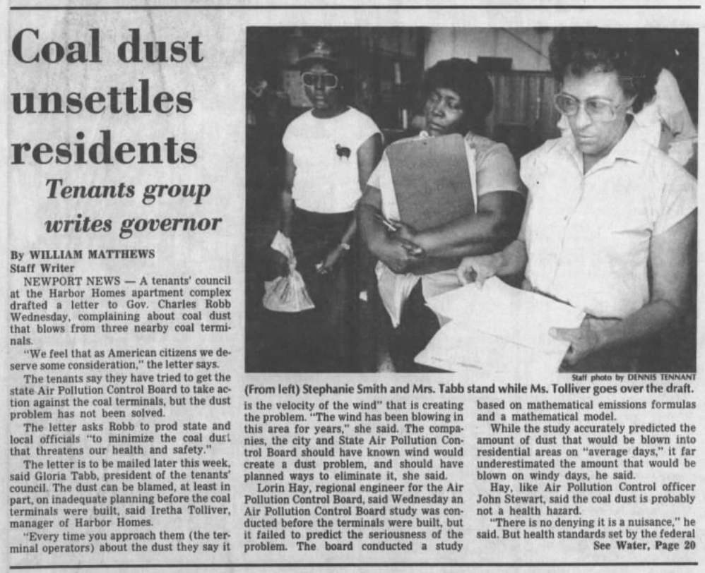 Coal Dust Unsettles Residents. Daily Press. May 24, 1984.